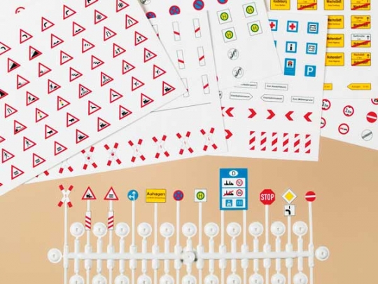 This kit contains a selection of over 780 traffic signs, signposts, town signs and 70 posts and bases which are printed on high quality carton. All signs reflect currents practice and are supplement by selected road signs used in the GDR from 1970 to 1991.
