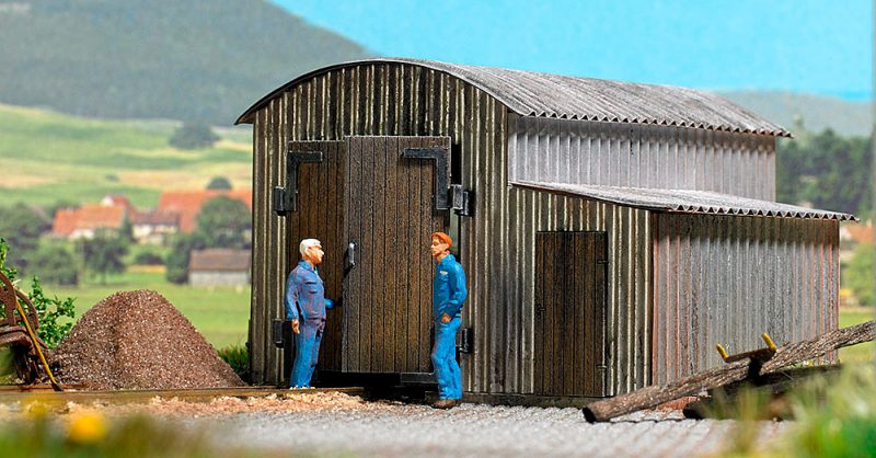 Kit for a narrow gauge, locomotive shed. The wooden side door with finely detailed hinges and handles can be opened. Suitable for straight tracks of the Busch narrow gauge railroad (Feldbahn) system.