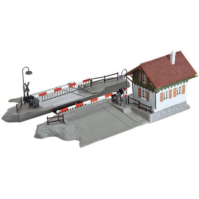 That level-crossing is fitted with an electric drive that realistically opens and closes the gates slowly and silently.
