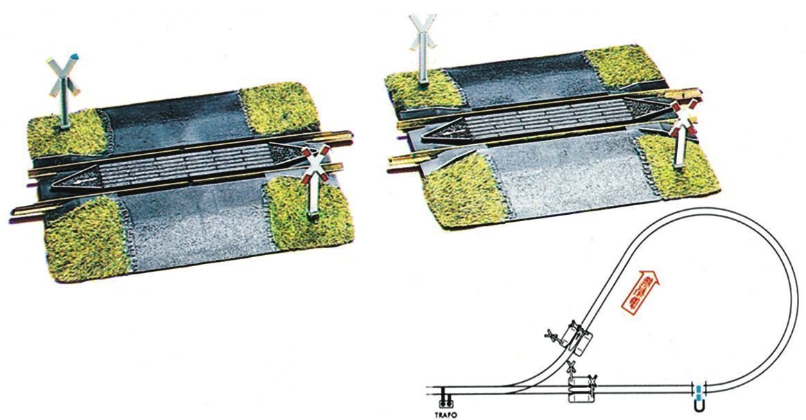 Reversing loop Set Two ungated level crossings 2 x 102 mm. With crossbucks, rerailer and insulated track. Can not be controlled digitally.