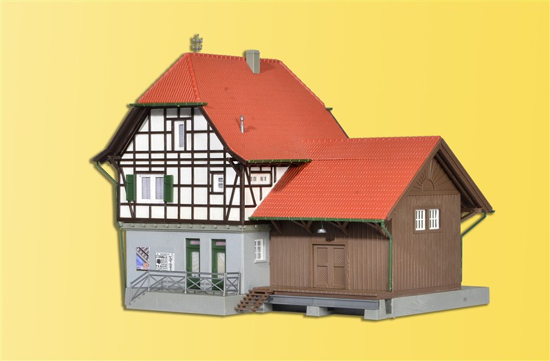 Functional kit. The station Osterheide, located on the Southern edge of the Luneburg Heath, shows the typical features of a rural village railway station. With its half-timbered upper floor and the adjacent goods shed, this model is very detailed and is compact in tight spaces. The station is supplied with a house illumination start set item No. 6005. Dimensions: L 19 x W 14 x H 16 cm.