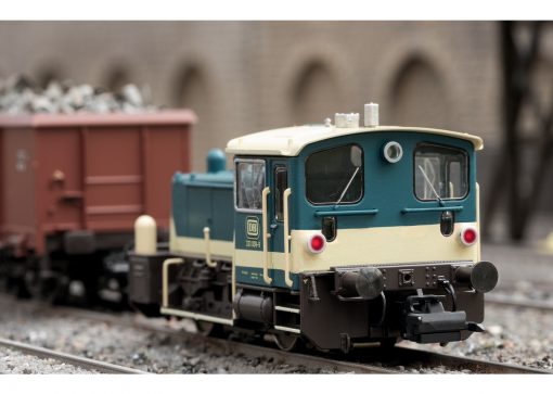 Prototype: German Federal Railroad (DB) class 335 (Köf III) diesel switch engine in Era IV. “Ocean Blue” / ivory paint scheme. Version with radio antenna. Road number 333 009-9. The locomotive looks as it did around 1980.