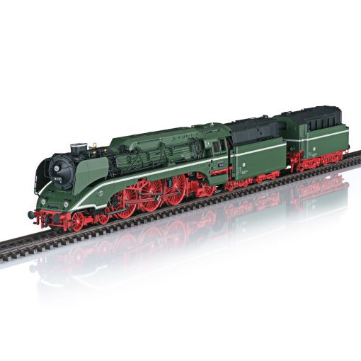 The locomotive has an mfx+ digital decoder and extensive light and sound functions. It also has controlled high-efficiency propulsion with a flywheel in the boiler. 3 axles powered. Traction tires. The locomotive and tender are constructed mostly of metal. There is a factory-installed smoke generator in the locomotive. It has dynamic smoke exhaust that varies with the locomotive speed and is digitally controlled. The triple headlights change over with the direction of travel, will work in conventional operation, and can be controlled digitally. There are also dual red lamps on the front of the locomotive, which can be controlled digitally. The cab lighting and the running gear lights can be controlled separately in digital operation. Maintenance-free warm white and red LEDs are used for the lighting. There is an adjustable close coupling with a guide mechanism between the locomotive and tender. There is a close coupler with an NEM pocket and a current-conducting guide mechanism on the tender for controlling headlights and marker lights on the auxiliary tender. The buffer height on the locomotive and tender adhere to the NEM. The auxiliary tender has operating, current-conducting close couplers at both ends. The lighting at the end of the tender can be selected by using a toggle switch on the floor of the tender. This lighting can be controlled digitally using the decoder for the locomotive. The minimum radius for operation is 360 mm / 14-3/16″. Streamlining without wheel cutouts below the cab is included for installation for large radius curves or display cases. Piston rod protection sleeves and heating and brake hoses are also included.