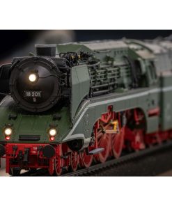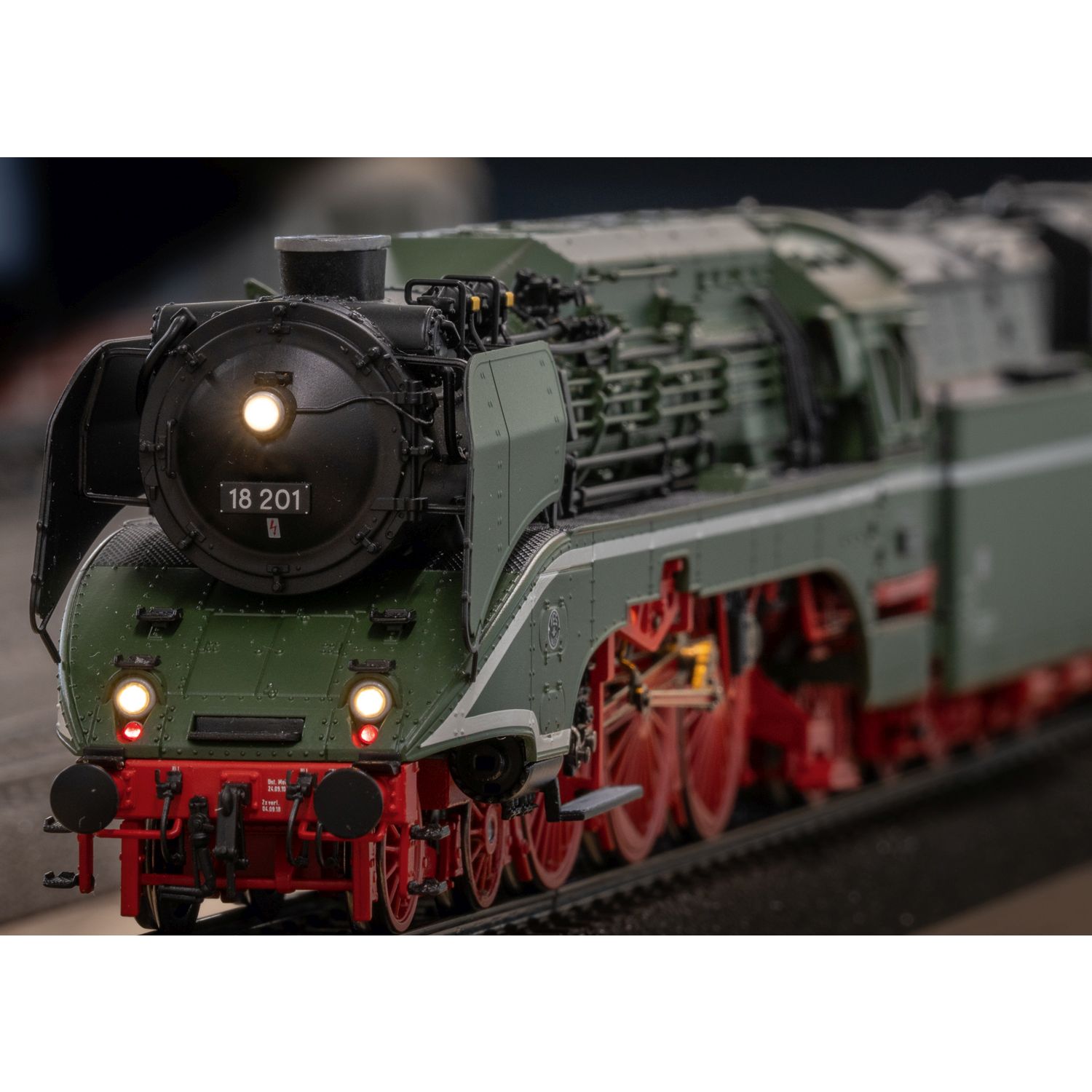 Prototype: Express steam locomotive, road number 18 201, with oil main firing and an auxiliary tender. Former locomotive of the German State Railroad of the GDR (DR/GDR), which was built as an experimental locomotive of the VES-M Halle, Germany (Saale) (Railroad Research and Development Locomotive Management Department) from parts of road numbers 61 002 and H45 024. The locomotive looks as it did around 2017, as it was used pulling special trains.