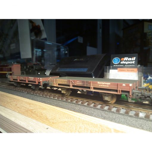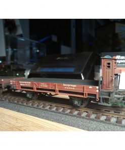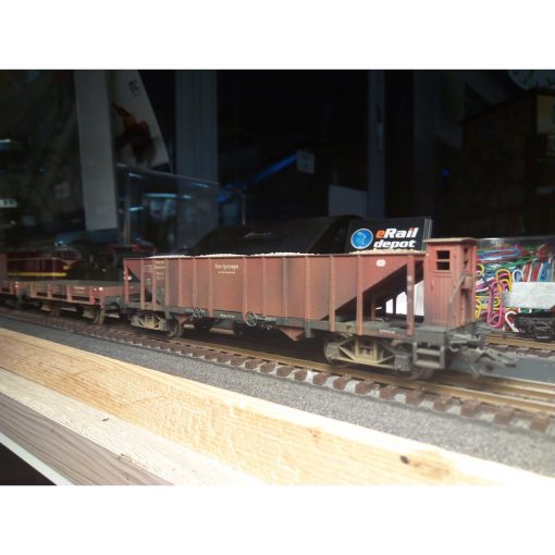 1x hopper car with ballast load, 2x flat cars one with brake man’s cab.