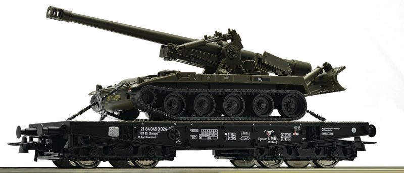 Heavy duty wagon of the Dutch State Railways that carries one Feldhaubitze M110A2 of the Dutch Army. Model with NEM 362 coupler pocket and close coupler mechanism.