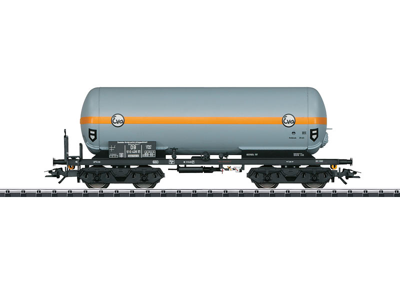 Four-axle pressurized gas tank car used on the German Federal Railroad (DB). Privately owned car painted and lettered for the firm Eisenbahn-Verkehrsmittel GmbH / Railroad Transportation Services, Inc. (Eva).