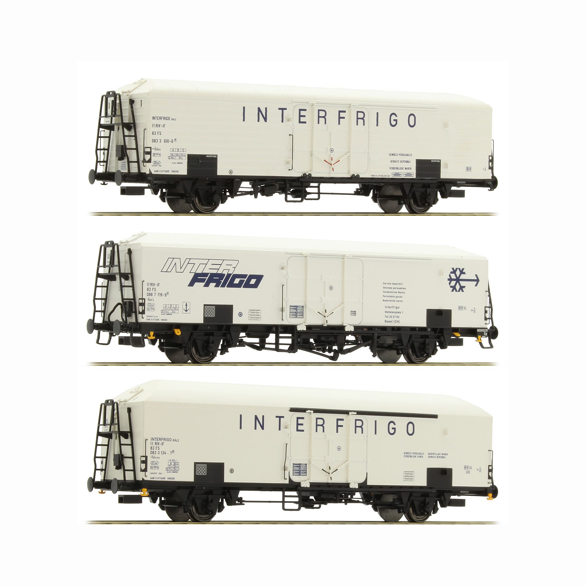 Three-piece set “Interfrigo” isothermic wagons, one of them with English gabarit, operated by the Italian National Railway Company (FS), epoch IV – V.
