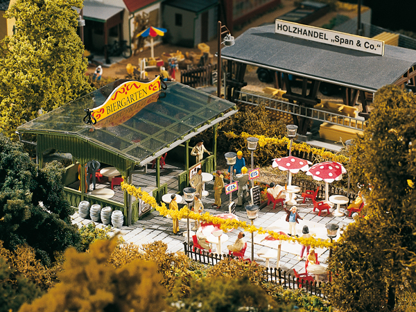Glassed-in open area, garden tables and chairs, sun shades, drink advertisements and foam flocking for flower beds.