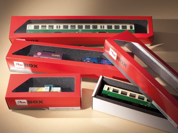 Storage and transport boxes for locomotives and carriages, since the packages for these items become worn out over time. Our attractive boxes can help. Cardboard lid with clear windows. Stable microwave box. The foam rubber insert protects your vehicles from damage. Collapsible box easy to set up, shipped lying flat.
