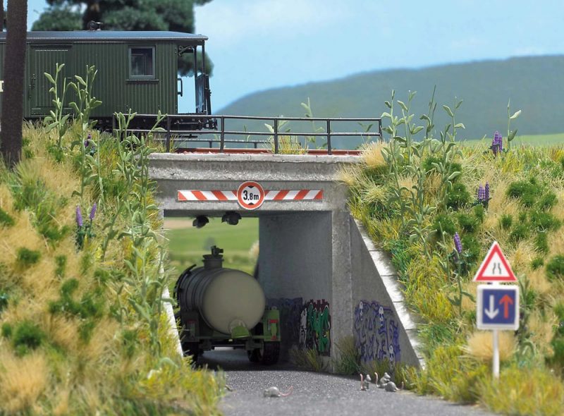This kit is for a concrete underpass is easy to assemble because it is made with high precision laser-cut method. The attached manual describes the few steps that are needed to assemble the pre-painted in color of concrete parts.
