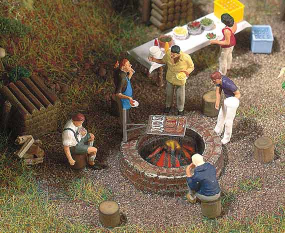One can almost smell the sausages cooking … “masonry” fire pit with campfire, which is illuminated by 2 lamps and an electronics circuit. The grill is complete with small sausages and steaks. Includes wood table, 2 wood seats and 6 stumps which can be used as additional seating.