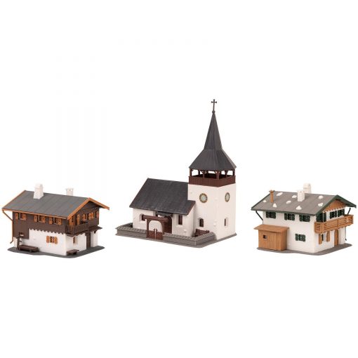 4-part village set consisting of two brick mountain houses in a typical Alpine style, one of which has a wooden structure on the upper floor, a small village church with a pointed tower hood and a hay barn that serves as a depot for firewood and hay.