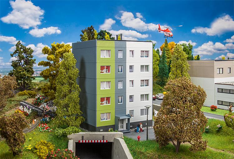Five-storey building construction with masonry plinth and a large-area facade painted in light green, grey and white on the front of that slab construction.