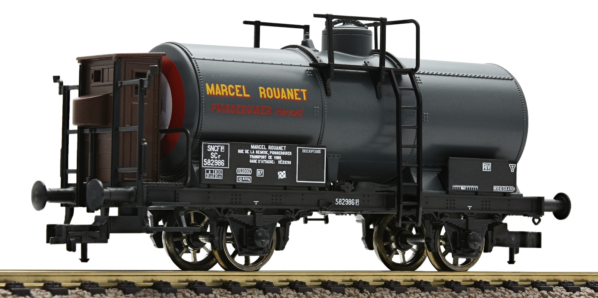 2-axle tank car “MARCEL ROUANET” with brakeman’s cab hired out to the French State Railways SNCF. Epoch III.