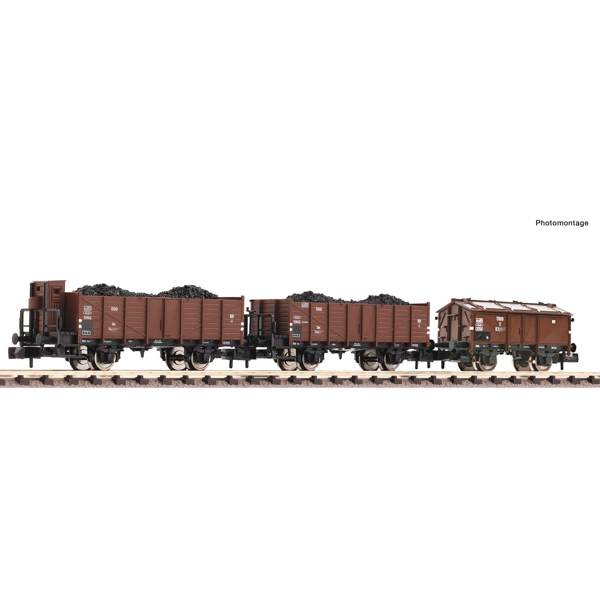 The set consists of a type K folding lid car, a type Om high-side gondola with a brakeman’s platform, and a type Om high-side gondola with a brakeman’s cab.