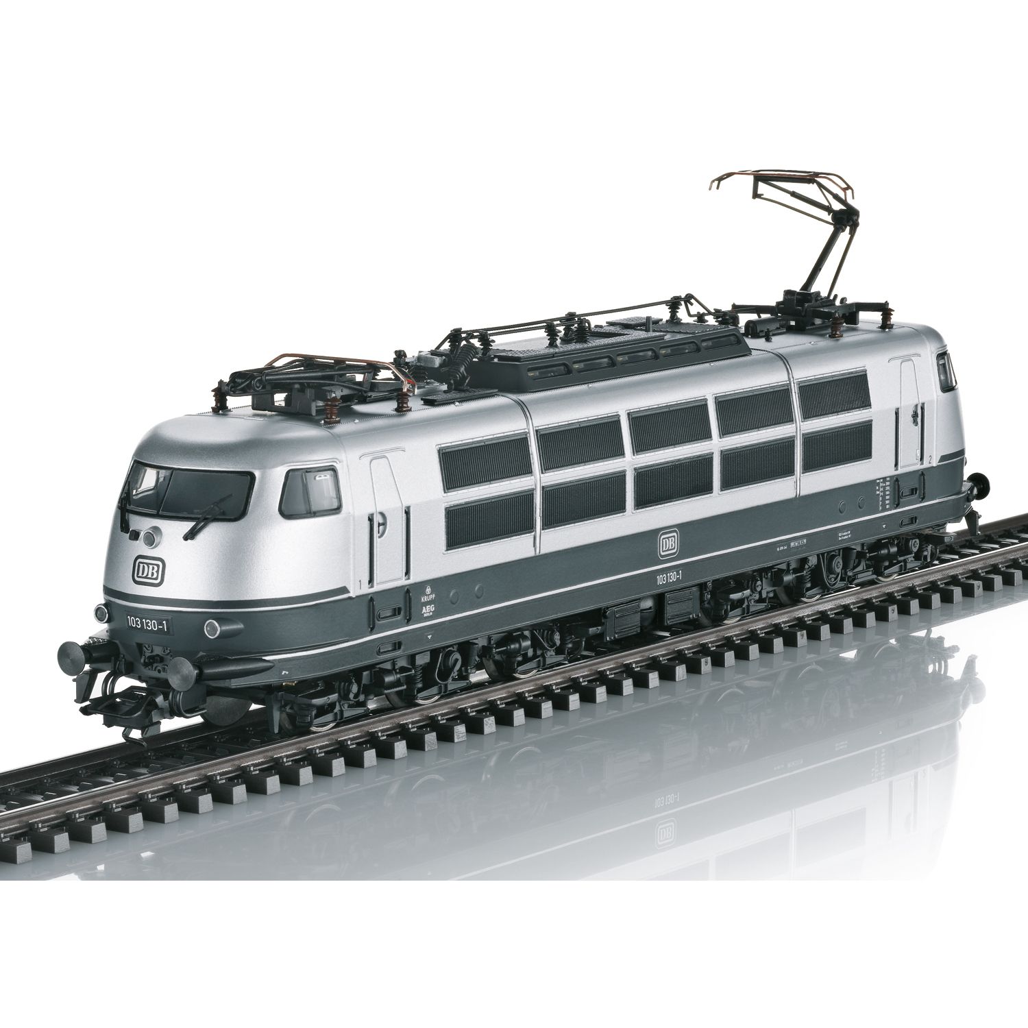 German Federal Railroad (DB) class 103.1 electric locomotive. Version with “short” cabs, single-arm pantographs, and buffer cladding. Fictitious paint scheme in protective silver for the 30th anniversary of the MHI. Road number 103 130-1.