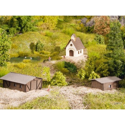 Noch 44315 – Z scale, Small Buildings Set, 2 Barns, 1 Chapel