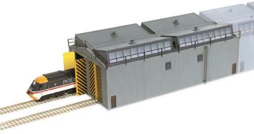 Train Shed Unit. As a single unit this superbly detailed and versatile Peco ”Manyways” kit is large enough to take the longest BR diesel or electric locomotive on each track. You can join the units together, end-to-end or side-by-side to provide accomodation for complete HST sets and diesel and electric multiple units. used thus, it can also represent a modern diesel maintenance depot. Employ them too as industrial units or factories, there are, infact, no limit to the many ways this versatile kit can be used. The all plastic pre-coloured parts render painting optional. there are opening doors at both ends, finished with correct high visibility black and yellow stripes. L: 349mm W: 168mm.