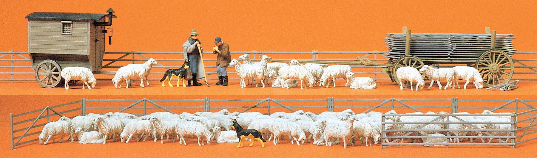 Shepherd with flock. 80 exclusively painted miniature figures, shepherd‘s van, rack wagon and 24 fence elements, each 44 mm long