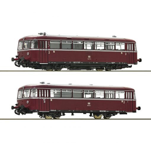 The railbus set contains a motor wagon class 798 and a control cab coach class 998 of the Deutsche Bundesbahn.
