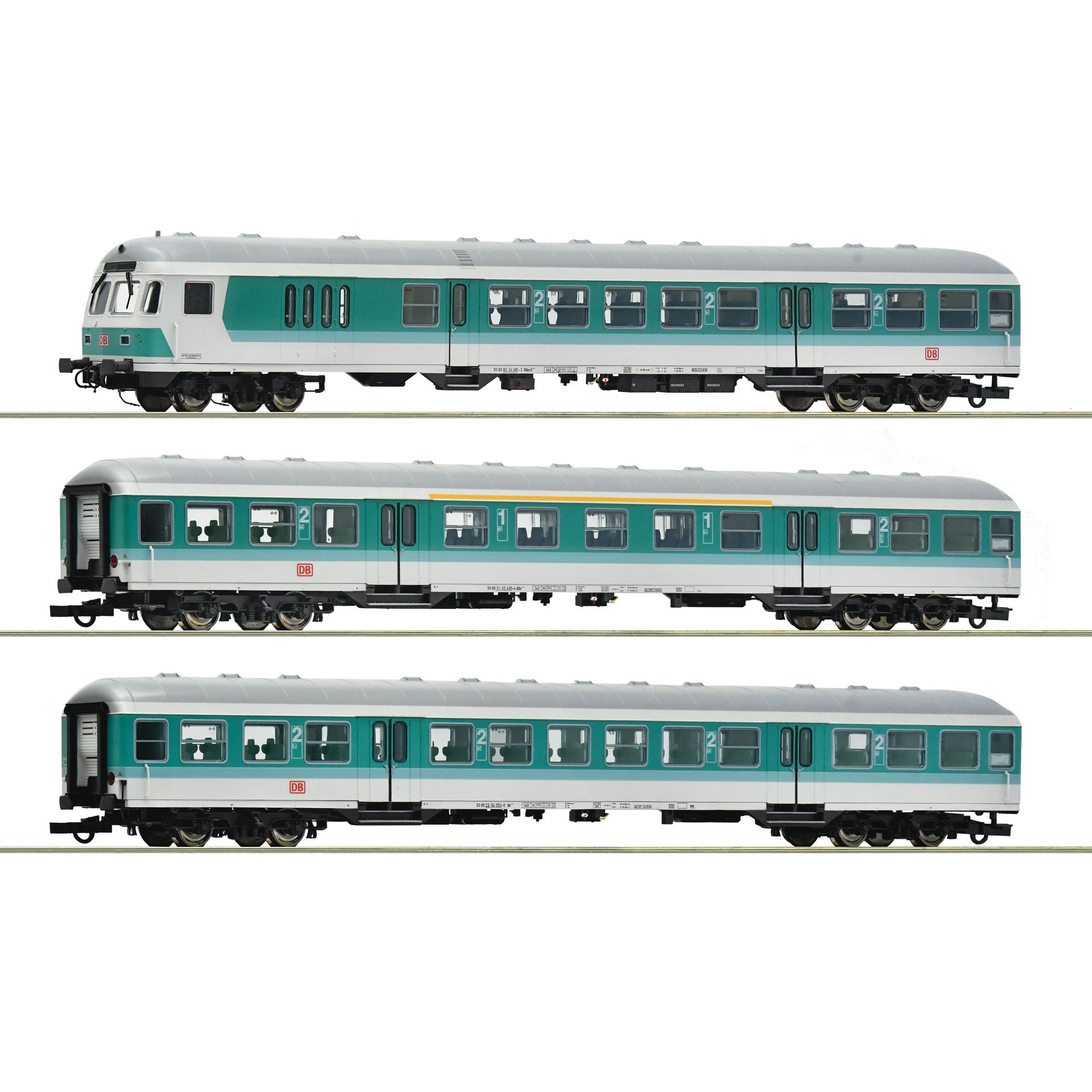Wagon set 1 with three commuter coaches of the Deutsche Bahn from the Stuttgart region in mint-turquoise and light grey livery.