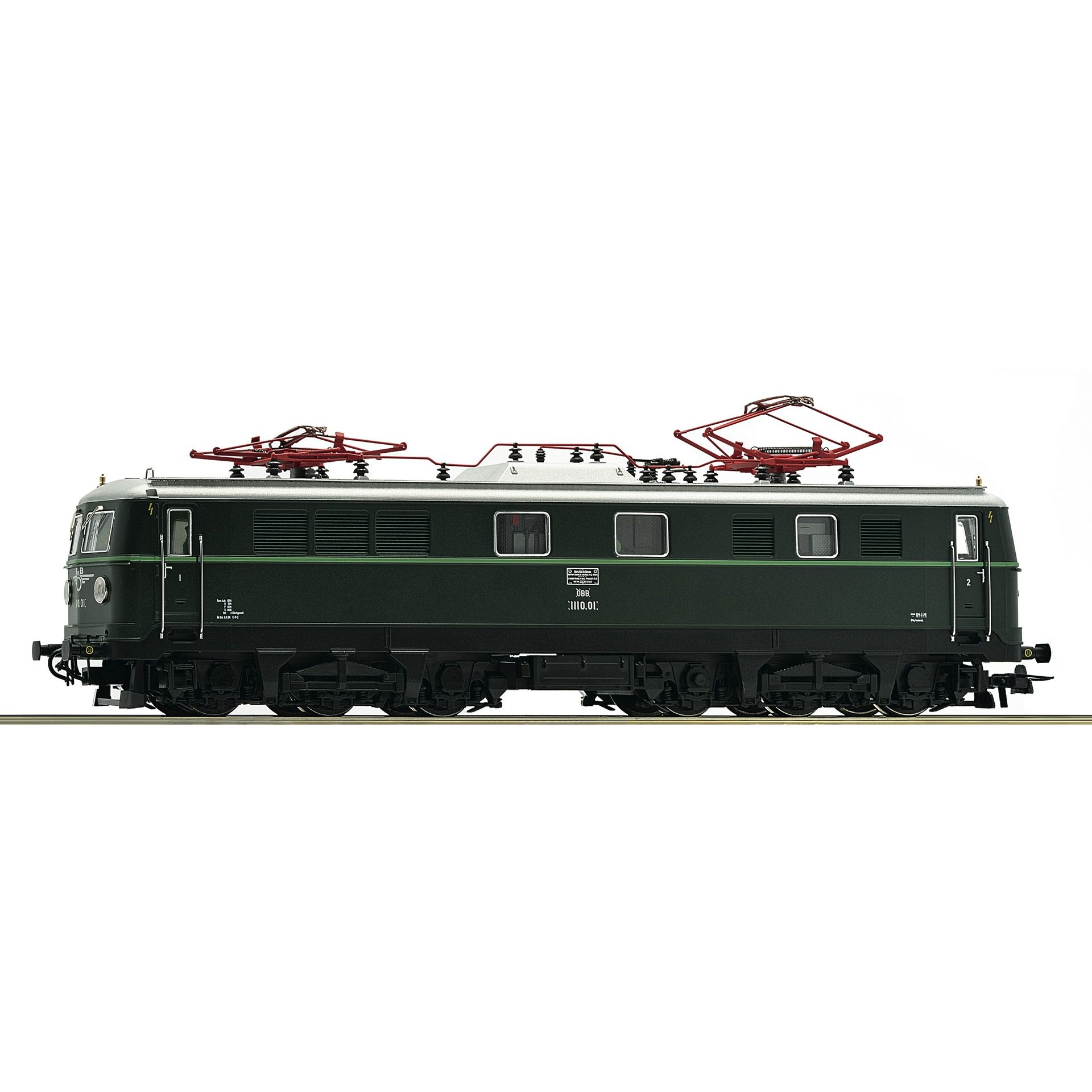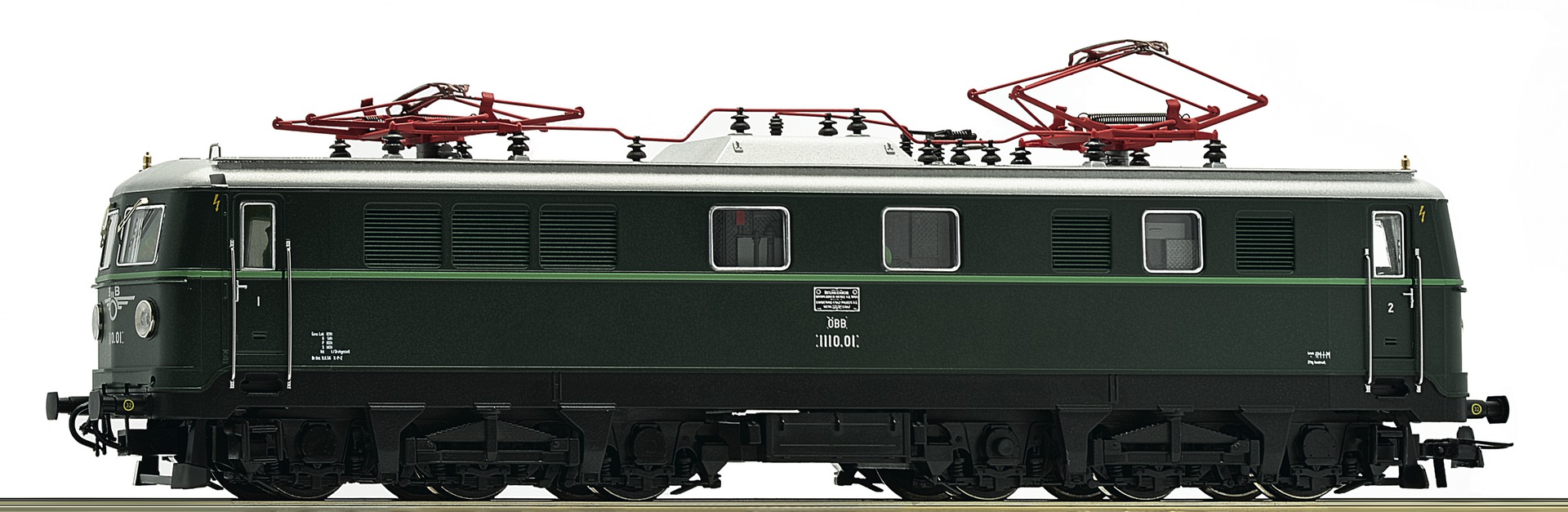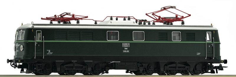 Electric locomotive series 1010 of the Austrian Federal Railways in fir green livery and with black chassis. True to the original modifications on the model: with triple headlight – without taillight. – metal grab irons – etched parts (wipers) – technically revised – PluX interface – LED lighting – 5 pole engine with mass flywheel. Two axles are equipped with traction tires to increase the traction power. Double headlight that changes with the direction of travel.