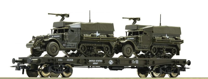 Flat wagon of the United States Army Transportation Corps that carries two half track vehicles. Epoch II-III.