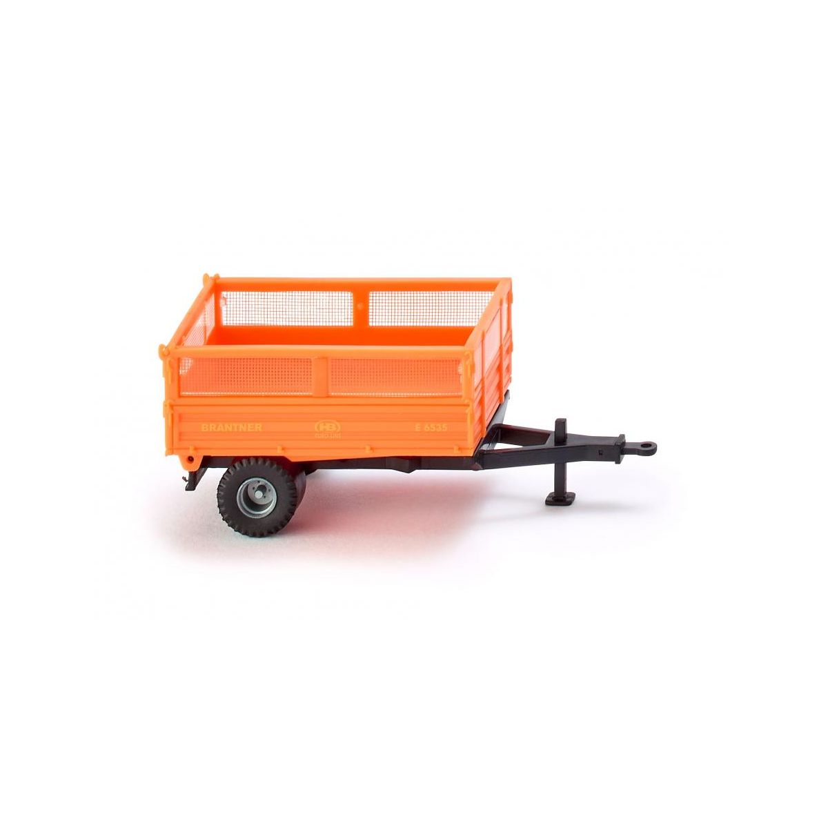 Chassis and jack in black. Flatbed body in municipal orange with transparent mesh top surround and wheel rims in silver. Red tail lamps. “Brantner” painted on the side in rapeseed yellow.