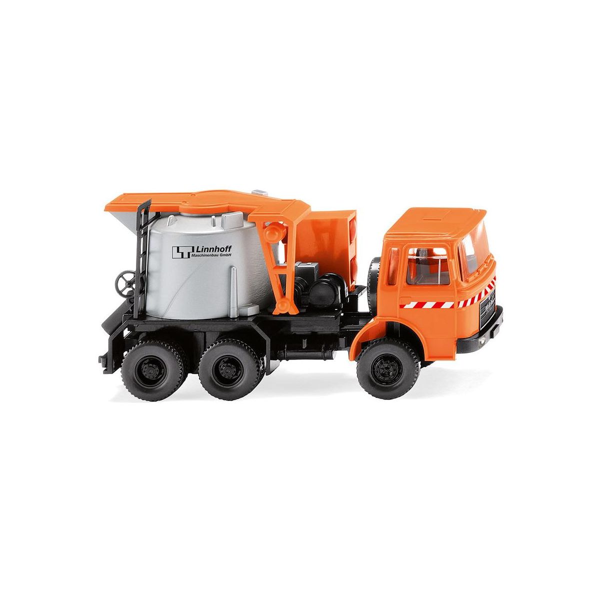 Driver’s cab pastel orange. Chassis and wheel rims black, interior anthracite grey. Black radiator grille with silver frame and “MAN Diesel” lettering. Red and white diagonal warning stripes on the front and the sides. Superstructure parts with push-off system, ladder and tar chute black, silver mastic asphalt container. Superstructure and gas cylinder bracket pastel orange. Red gas cylinder inserted. Tank imprint on both sides with black logo “Linnhoff Maschinenbau GmbH”.